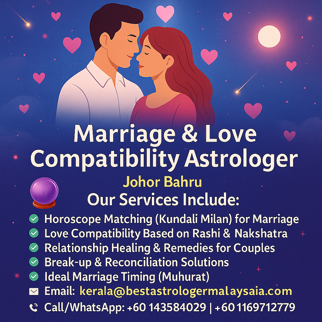 💑✨ Marriage & Love Compatibility Astrologer – Johor Bahru, Malaysia Unlock Your Relationship Destiny with Vedic Wisdom Are you wondering if your partner is truly “the one”? Facing emotional ups and downs in your love life? Confused about when is the right time for ...