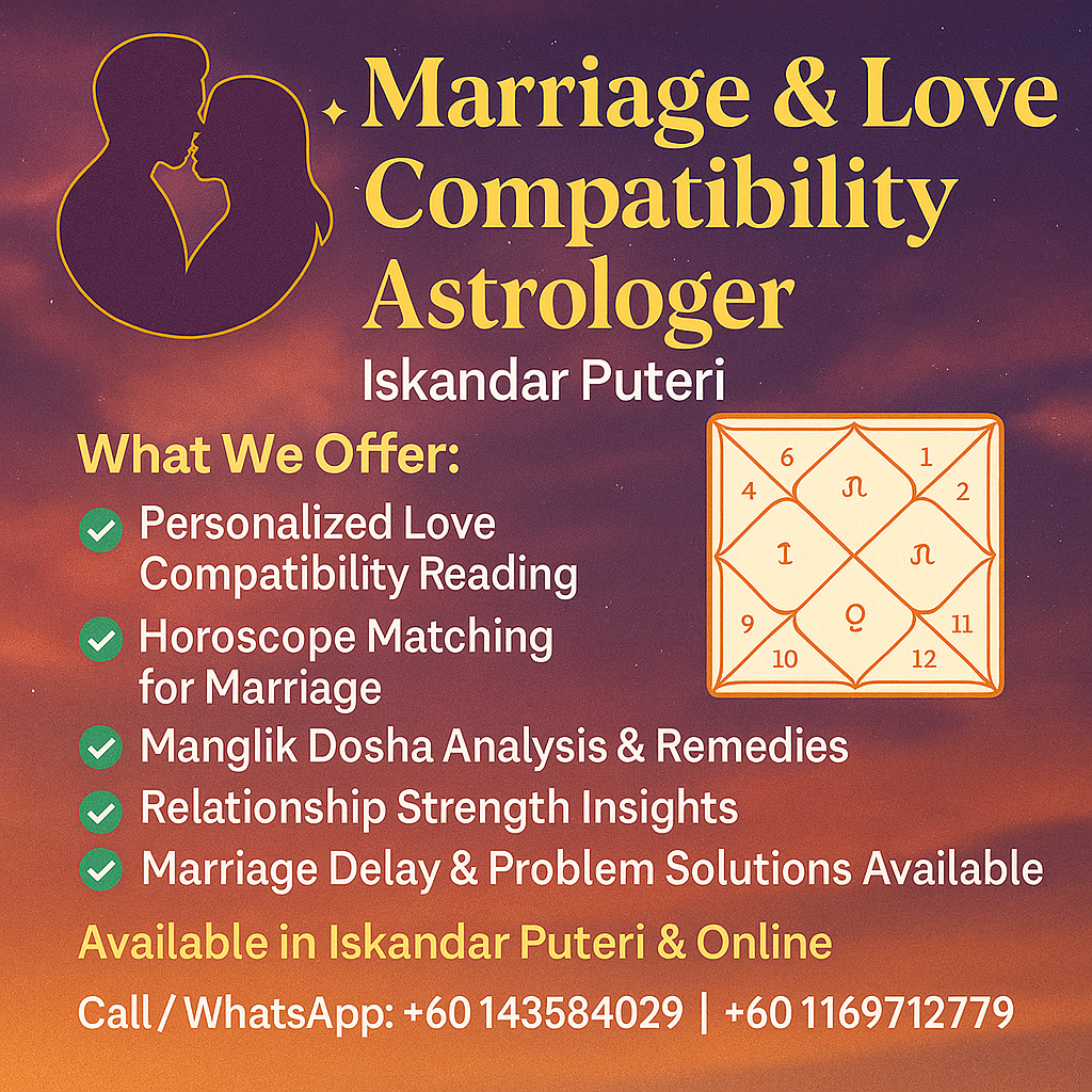 💑 Marriage & Love Compatibility Astrologer – Iskandar Puteri 🌙✨ Unlock the Secrets of a Blissful Relationship with Astrology Are you in a relationship and wondering if your stars truly align? 🌌 Whether you’re planning to get married or already in a committed bond, ...