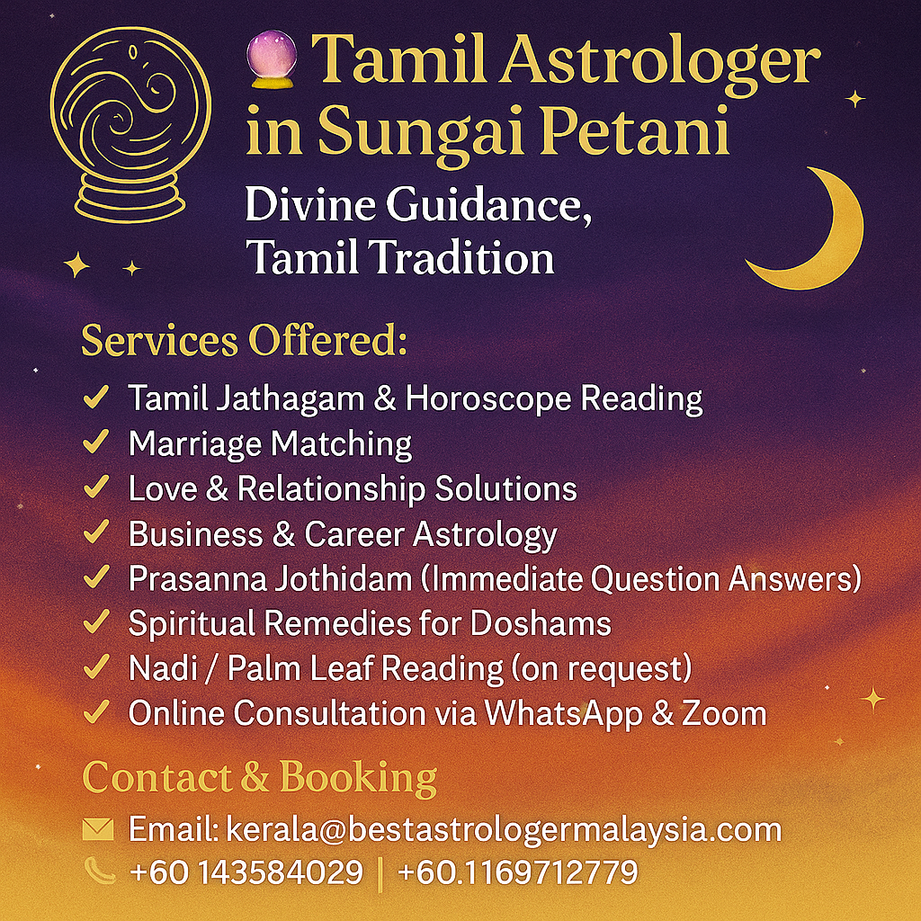 🔮 Tamil Astrologer in Sungai Petani – Divine Guidance, Tamil Tradition 🌙 Are you searching for a trusted Tamil astrologer in Sungai Petani, Kedah? 🌟 Discover the divine power of Vedic Astrology, Tamil Jothidam, and spiritual remedies with our highly experienced astrologer – offering ...