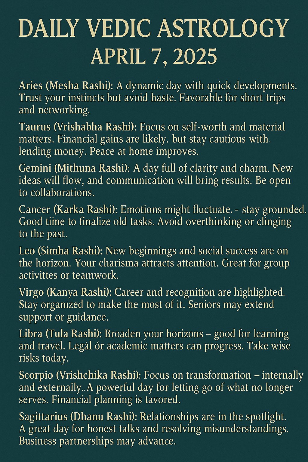 Great! Here’s a general Vedic astrology prediction for today (April 7, 2025) based on Moon signs (Rashi): Aries (Mesha Rashi):A dynamic day with quick developments. Trust your instincts but avoid haste. Favorable for short trips and networking. Taurus (Vrishabha Rashi):Focus on self-worth and material ...